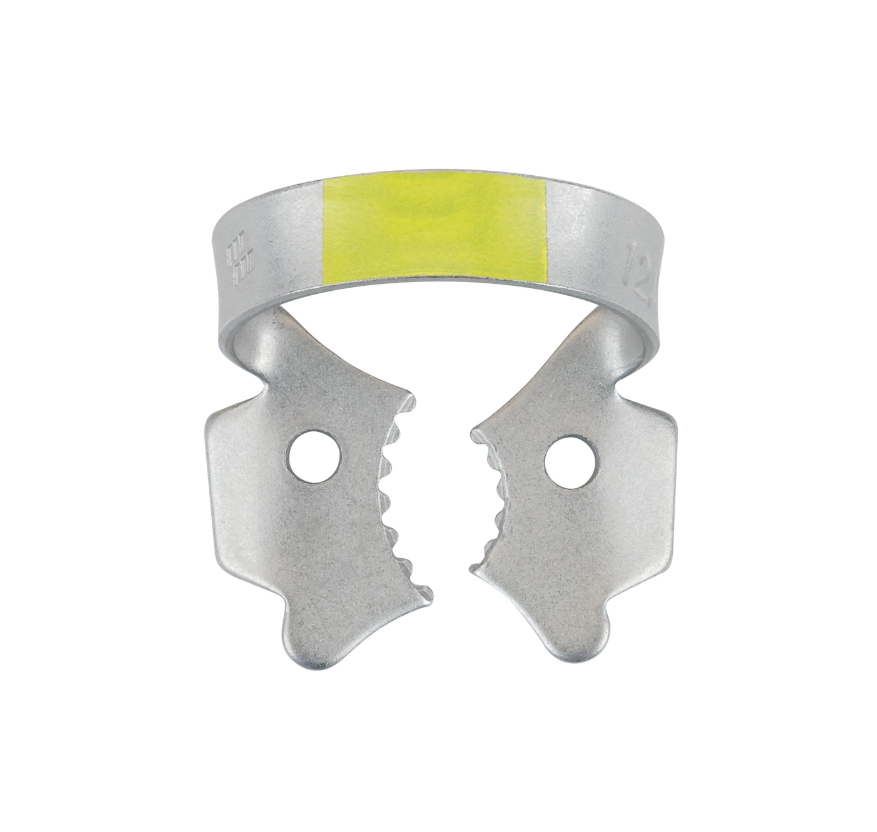 Right mandibular molar clamp, with serrated jaws for partially erupted teeth.